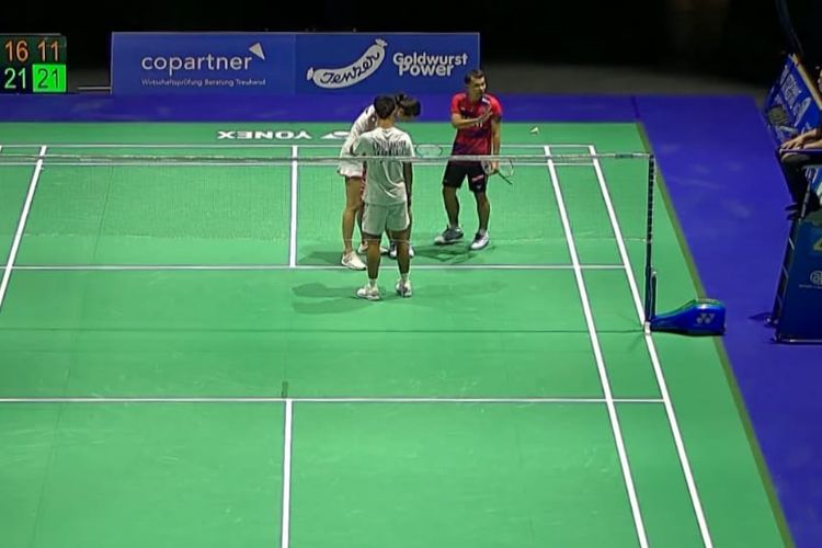 Momen dramatis terjadi ketika poin kemenangan diraih Rinov/Pitha, 21-11.
